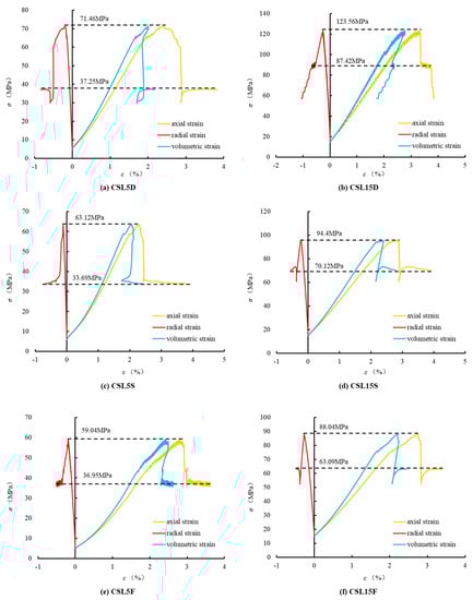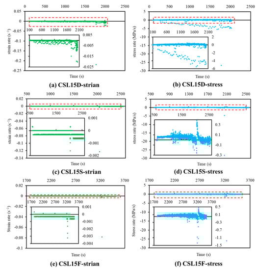 The curves of radial strain and axial stress variation rate versus time for coal specimens under different conditions of high confining pressure (15 MPa) are shown in Figure 8. The stress variation rate of coal in the three states gradually increases at the beginning of loading and starts to show negative values as the test proceeds, which means that the stress appears to decrease under the condition of axial constant displacement loading, indicating that damage to the specimen has occurred. This phenomenon appears earliest in dry coal, and in freeze-thaw coal when it undergoes plastic deformation before fracture. This indirectly confirms that freeze-thaw coal suffers additional damage before loading.