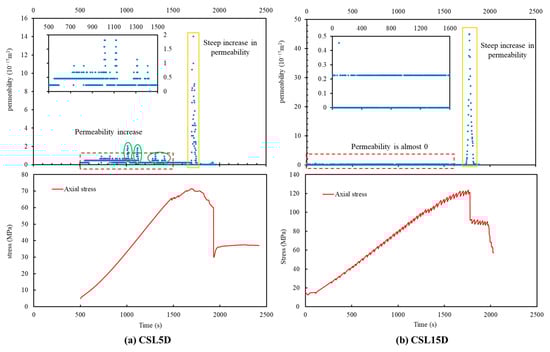 The permeability evolution curves of dry coal under two different confining pressures (5 MPa, 15 MPa) are shown in Figure 4. The permeability of the coal rock specimens under low confining pressure (5 MPa) is approximately 0.2 to 1 × 10−17 m2 during the early stage of loading. As the test proceeds, the axial stress gradually increases and several brief increases in permeability (marked by green circles) occur, increasing to 0.6–2 × 10−17 m2. Note that each brief increase in permeability is quickly followed by a decrease in the initial value before the increase. At the peak of the axial stress, the specimen breaks down and the permeability suddenly increases steeply (marked by the yellow rectangle), at which point the magnitude of the increase exceeds that of any previous increase (by an order of magnitude, with a maximum value of 14.03 × 10−17 m2), and as the test proceeds, the permeability quickly returns to its initial level at the post-peak stage of the test. Under high confining pressure (15 MPa), the permeability of the coal specimens ranged from roughly 0–0.23 × 10−17 m2. At the start of the loading, the initial permeability experienced a notable decrease compared to the conditions observed in the low-confining-pressure tests. As the test progressed and the axial stress gradually increased, the permeability remained relatively stable without significant changes. However, when the axial stress reached its peak, just before specimen fracture, the permeability exhibited a sudden steep increase (highlighted by the yellow rectangle) to a value of 44.81 × 10−17 m2. Following this sharp increase, the permeability quickly returned to the magnitude observed at the beginning of the test.