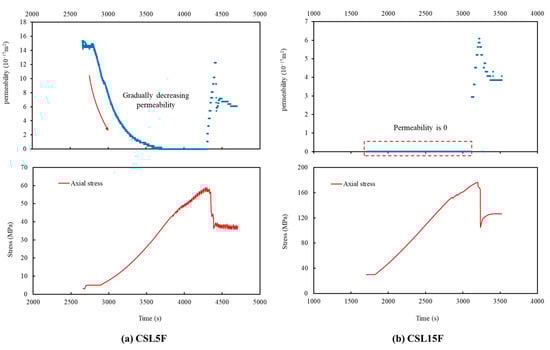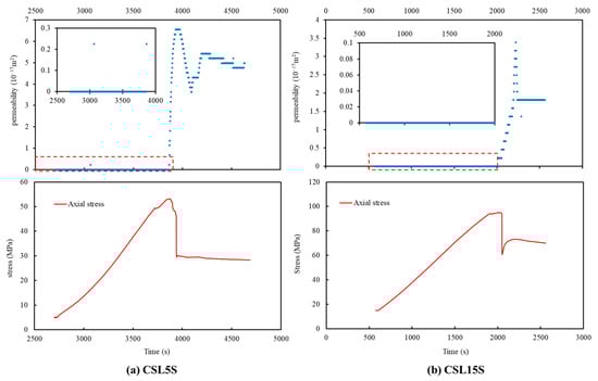 The permeability evolution curves of the coal after freeze-thawing at two confining pressures (5 MPa, 15 MPa) are shown in Figure 6. The permeability of the coal specimens under the low confining pressure (5 MPa) is 14.68 × 10−17 m2 at the early stage of loading. As the test proceeds, the axial stress gradually increases and the permeability of the coal specimen gradually decreases to 0. At the peak of the axial stress, the specimen fractures and the permeability gradually increases to 12.24 × 10−17 m2, and then gradually decreases. As the test proceeds (in the post-peak phase), the permeability is consistent with the characteristics of saturated coal, with a period of increase followed by a steady decrease, during which the post-peak residual stress remains essentially constant. Under high confining pressure (15 MPa), the permeability of the coal specimens is stabilized at 0 at the early stage of loading, indicating that the seepage channels generated by freeze-thaw action are completely blocked under the stress. As the test proceeds, the axial stress gradually increases and the permeability does not improve significantly. Just before the axial stress reaches the peak specimen fracture, the permeability first increases steadily and then accelerates to 5.88 × 10−17 m2, and finally decreases gradually to a stable value of 3.85 × 10−17 m2.