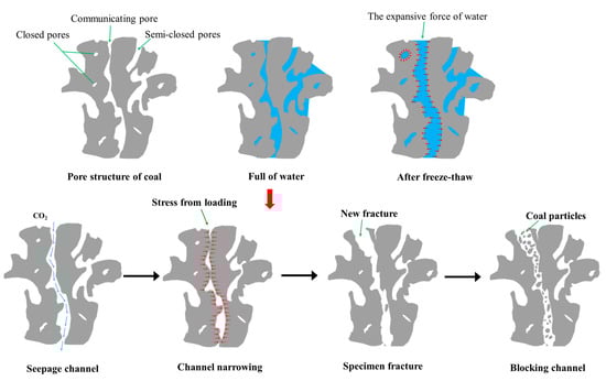 In order to discuss the evolution of permeability in coal specimens in different states (dry, saturated, freeze-thaw) and to reveal the mechanism of freeze-thaw damage on the permeability evolution of coal and the gas migration within coal when stress changes occur during mining activities, this section of the article focuses on the theoretical evolution of coal deformation and the macroscopic permeability of the specimens to explain the observed experimental phenomena.