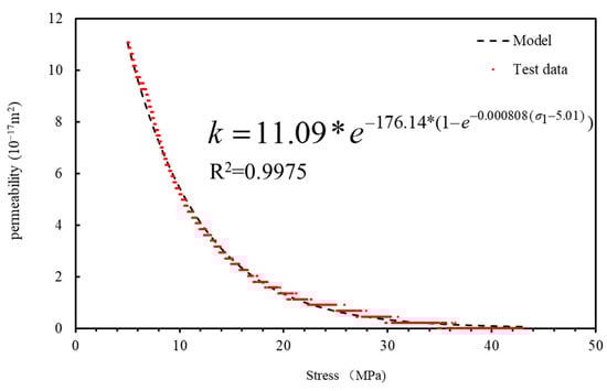 Figure 10 shows the evolution of the permeability of frozen-thawed coal with axial stress under 5 MPa confining pressure. The permeability of the coal tends to be close to 0 as the axial pressure gradually increases to 40 MPa. The R2 of 0.9975 is obtained by fitting the results, indicating that the freeze-thaw coal can be well-fitted with the S and D model. During this period of testing, the pores and cracks of the coal involved in the seepage channels, which are either natural or artificial, gradually close to blockage.
