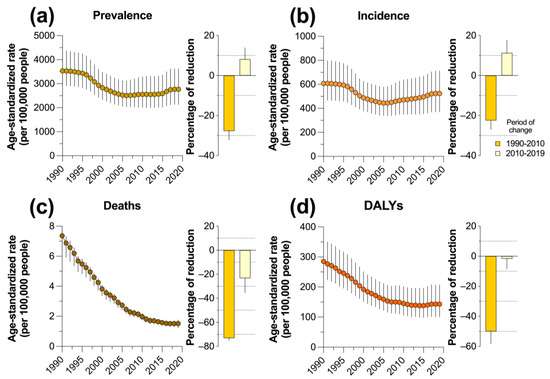 In general, changes in the crude estimates of the burden of asthma in Mexico were observed throughout the period studied. Although there was a trend toward a reduction in the number of cases from 1990 to 2000, during the decade from 2010 to 2019, there was an increase in the national burden of asthma. The percentage of deaths due to asthma increased by 1.56%, with prevalence and incidence showing the largest increase in the period (Table 1). A similar trend was observed in the age-standardized prevalence and incidence rate per 100,000 persons; despite the substantial reduction in the period from 1990 to 2010, there was an increase from 8.22 to 11.3%, respectively, between 2010 and 2019 (Figure 1a,b). By contrast, both mortality and DALY rates tended to decrease between 1990 and 2019, although, in both measurements, a differential slowdown in the reduction was observed during the last decade, as the age-standardized mortality rate per 100,000 persons decreased by 23.3% (95% uncertainty interval, 11.40 to 35.38%) from 2010 to 2019, and the DALY rate by 1.64% (8.40 to 5.24%) in the same period (Figure 1c,d).