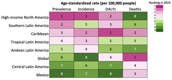 Ranking of the age-standardized prevalence, incidence, DALYs, and deaths per 100,000 people due to asthma in 2019. According to the GBD, the American continent is divided into five regions that include 36 countries. Mexico is located within the Central Latin America region, which also includes Colombia, Costa Rica, El Salvador, Guatemala, Honduras, Nicaragua, Panama, and Venezuela.
