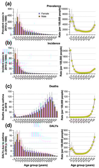 Distribution of (a) prevalence, (b) incidence, (c) mortality, and (d) DALYs caused by asthma in Mexico in 2019 by age group and sex (left panel) and rate per 100,000 persons by age group (right panel).