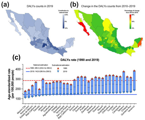 The GBD 2019 study represents the most comprehensive global effort to understand the 369 leading causes of disease and injury affecting the population [19], including the study of the risk factors associated with health loss in men and women of all age groups in 204 countries and regions [20]. The present study was conducted in compliance with the GBD protocol by members of the GBD Mexico collaborative network [21,22]. Our study presents a secondary analysis of the estimates produced by the GBD in the last iteration of 2019 at the Institute for Health Metrics and Evaluation (IHME), which is an independent institute at the University of Washington. Accordingly, our study used the estimations publicly available from the Global Health Data Exchange (GHDx) database of the IHME. The estimates produced by the GBD complied with the Guidelines for Accurate and Transparent Health Estimates Reporting (GATHER) statement [23].