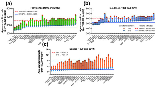 Finally, to comparatively analyze the change in the asthma burden between states and the national benchmark, the age-standardized rate (per 100,000 people) for the beginning and end of the period (1990 and 2019) was plotted for each state and compared against the national average. In Figure 4c, a high initial disparity is shown, with rates ranging from 386.9 to 180.19 DALYs per 100,000 people, which declined to comparable estimates (109.94 to 184.95) in 2019 in all states, among which nine were below the national average. Similar results are displayed in Figure 5, which summarizes the change in the age-standardized prevalence, incidence, and mortality rates per 100,000 people at the subnational level from 1990 to 2019. In general, there were high and heterogeneous estimates at the beginning of the period, which decreased across states by 2019. Only 6 states had standardized prevalence and incidence rates below the national average in 2019, while 15 states had an asthma mortality rate below the national benchmark. Mexico City, Nuevo Leon, and Estado de Mexico consistently ranked below the national average, while Quintana Roo and Veracruz were the two states with the highest values for all three measures.
