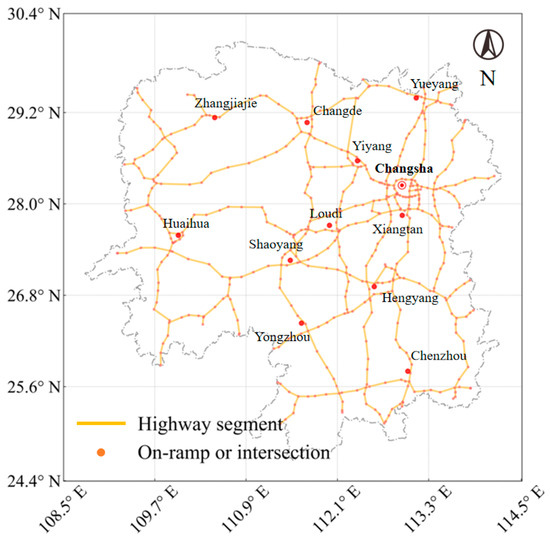 The used highway network data were provided by the Hunan Communications Research Institute Co., Ltd. and the Baidu Map Open Platform. The Hunan highway network was composed of 506 nodes (i.e., on-ramps, intersections) and 550 links (i.e., highway segments). The recorded node information includes the ID and the coordinate of each on-ramp or intersection. The recorded link information includes the highway ID, the origin node ID, the destination node ID, the length, the number of lanes, and the designed speed of each highway segment. Moreover, volume over capacity () was used to quantify the service level of a highway segment (see Appendix A). The highway network of Hunan Province with detailed spatial context information is shown in Figure 1.