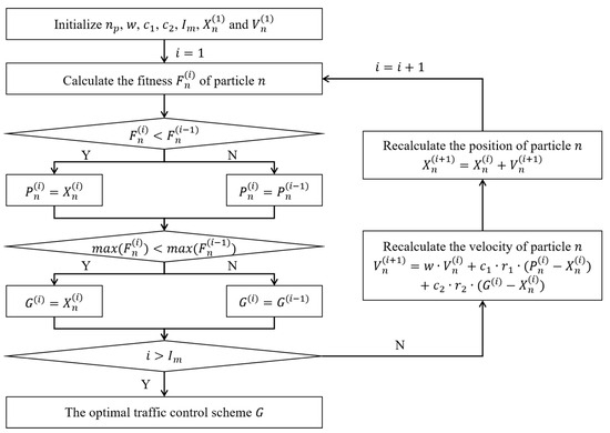Step 1: The number of particles was set to , where each particle represents a traffic control scheme . An initial position (i.e., the initial solution) and an initial velocity (i.e., the perturbation of solution) were randomly generated for each particle, where is the particle ID, .