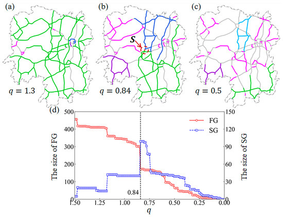 The percolation process of Hunan highway network. (a–c) The connectivity of the highway network when was set to 1.3, 0.84, and 0.5. Different colors represent different clusters. (d) The size of FG and the size of SG in the network percolation process.