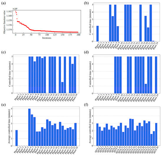 (a) The convergence of the objective function value. The controlled time in each phase for (b) Yanglousi on-ramp, (c) Chengtoushan on-ramp, and (d) Changsha on-ramp. (e) The average controlled time in each phase. (f) The average controlled time at each on-ramp.