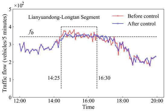 We calculated the number of vehicles arriving at the percolation bottleneck during each 5-min time window after implementing the traffic control scheme. As shown in Figure 7, there is an obvious decrease in traffic flow at the percolation bottleneck. In particular, the maximum traffic flow reduced by 9.95%, and the total traffic flow during the heavy traffic period reduced by 1.56%, implying that the generated traffic control scheme could alleviate the traffic pressure at the percolation bottleneck.
