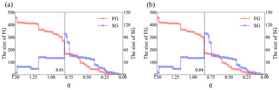 (a) The size of FG and the size of SG after controlling the traffic flow of the percolation bottleneck. (b) The size of FG and the size of SG after controlling the traffic flow of the most congested highway segment.
