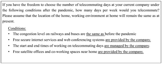 The survey on post-pandemic telecommuting frequency incorporated two components: an expected and a preferred frequency. On the one hand, the respondents were asked to answer what their expected telecommuting frequency will be, considering their companies’ policies and culture. On the other hand, the respondents were asked to indicate their preference for telecommuting frequency after the pandemic without considering their companies’ policies and culture in the stated preference question. Both expectations and preferences for telecommuting frequency were measured on a 6-point scale: five times a week (no office commutes at all), four times a week, three times a week, twice a week, once a week, and never (commutes to the office every day). The four two-level factors applied in the experimental design for the stated preference survey are listed in Table 1. Based on the orthogonal Taguchi array, eight combinations of the four factors representing the eight hypothesized scenarios were obtained, and one scenario was randomly selected and presented to each respondent. Figure 1 illustrates how one of the hypothesized scenarios was presented to the respondents in the questionnaire.