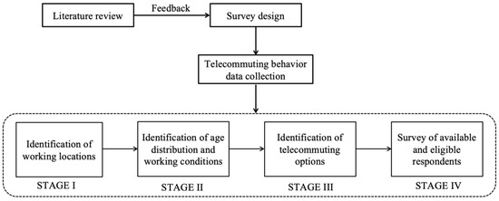 The study sample was obtained from MACROMILL, an online research company. A prescreening of 10,000 employees (excluding self-employed employees) in three major metropolitan areas of Japan was conducted in five phases. The data collection process is shown in Figure 2. The first stage involved identifying the distribution of their work locations. Particularly, employees whose workplaces were within a 50 km radius of the city center of Tokyo’s 23 special wards, Osaka City, and Nagoya City, were selected. Screening questions for controlling the sample of respondents aged 25 years or older with more than one year of experience in their current workplace and working five days per week were implemented in the second phase. The purpose was to eliminate the effect of unstable work status on employees’ telecommuting options. To avoid bias in telecommuting preferences arising from the supply side, the third stage confirmed whether the respondents in the sample had telecommuting options. The age distribution of participants was determined in the fourth step. The proportion of employees in each age group with telecommuting options obtained in the third phase was multiplied by the census age distribution to obtain the sample size for each age group. Finally, the ratio of employees in Tokyo, Osaka, and Nagoya was set at 2:1:1 to maintain consistency with the census data.