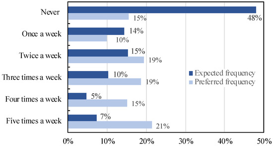 Regarding household characteristics, the presence of preschool children is associated with both high expectations and preferred telecommuting. The presence of preschool children is usually associated with increased family responsibilities and reduced mobility [47]. In addition, income and car ownership have no significant effect on preferred telecommuting frequency. The results indicate that mid- to high-income employees are more likely to frequently telecommute. Their industry or position probably allows greater flexibility in the workplace. For those with cars, the company is less likely to offer frequent telecommuting opportunities. This is perhaps because they have more commuting options than those without cars.
