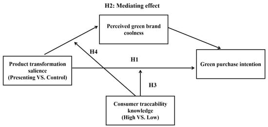 Furthermore, the application of digital technologies can contribute to green innovation and sustainable development [55,56]. For example, the adoption of digital traceability systems can enable brands to efficiently provide product information to customers to demonstrate their dedication to environmentally friendly practices [57]. Consumers with a good understanding of digital traceability can be more aware of the way a brand is using digital technologies to incorporate green innovation efforts into its business. As a result, customers tend to associate the brand’s innovative and environmentally friendly practices, as well as have a stronger perception of the brand’s coolness. Hence, we postulate that high traceability knowledge provides the foundation for PTS communication to generate higher consumer perceived credibility regarding a brand’s ability to deliver superior “green value” and creative “green production”, as well as reinforce the associations between green innovation and brand coolness, ultimately leading to enhanced perceptions of green brand coolness and higher purchase intentions. Conversely, low-level traceability knowledge attenuates the positive impact of PTS communication on green brand coolness perception and purchase intentions, as it presents more difficulty in processing green innovation associations from PTS messages, resulting in less green brand coolness perception and purchase intentions. As such, we propose the following hypothesis: