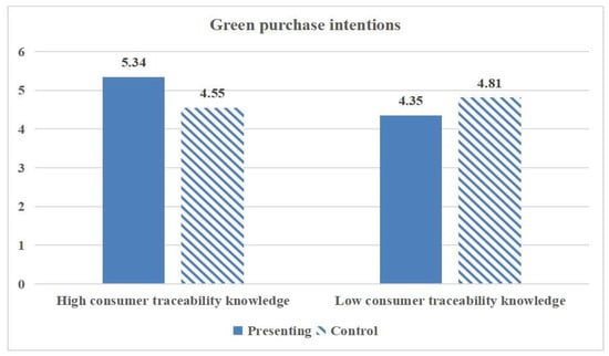Moreover, the interaction effect between PTS and consumer traceability knowledge on green purchase intention was significant (F = 84.60, p = 0.00). In particular, when participants possessed more consumer traceability knowledge, those who read PTS messages reported higher green purchase intention than respondents who received general green messages (MHigh_Presenting = 5.34; SD = 0.64, vs. MHigh_Control = 4.55; SD = 0.65, p = 0.00 < 0.05). When participants possessed less consumer traceability knowledge, those who read general green messages reported higher green purchase intention than respondents who received PTS messages (MLow_Presenting = 4.35; SD = 0.60, vs. MLow_Control = 4.81; SD = 0.72, p = 0.00 < 0.05). Hence, H3 was supported (Figure 4).