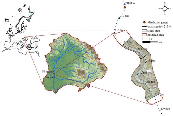 The study area was located on the Lower Tisza, Hungary. The water level was measured at Mindszent gauge station. The modelled section (216–209.6 fluvial km) represents an artificially confined floodplain and a freely meandering channel. Only the middle part (215–210 fluvial km) of the modelled area was used for the analysis, and the water levels were compared at one cross-section (213.4 fluvial km).