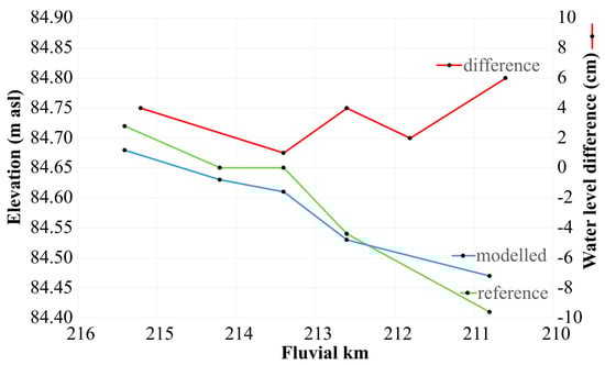 The calibration of the model was based on the water level measurements along the artificial levees at the peak of the 2006 flood. During the runs, the recorded water levels’ elevation and the model’s calculated ones were retrieved and used to generate a hydrograph (Figure 2). The model adequately represents water levels, though deviations (−9 cm) in the upstream section of the modelled area exist due to the small model area, the extremely low slope (≤2.9 cm/km) of the river, the effect of the reduction of the grid resolution (10 m), and the uncertainties of the water level measurements. Therefore, the flow conditions were analysed in detail in the central part of the modelled area (Mindszent: 215–210 fluvial km), where the accuracy was within ca. 5 cm.