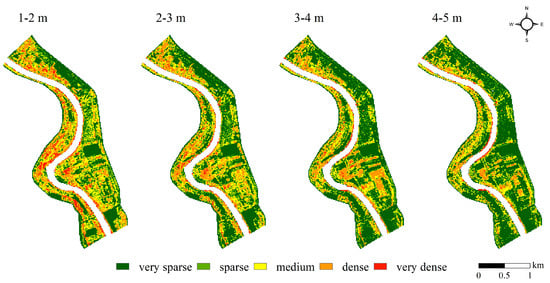 Overbank flood waves submerge the vegetation of the 1–2-m height zone approximately every second year, when the water level at the Mindszent gauging station is 600–700 cm. In this height zone, dense (23%) and very dense (5%) understorey patches are common (Figure 4, Table 2). The vegetation is especially dense in abandoned gardens, fallow agricultural fields, and unmanaged forests. In contrast, patches with very sparse (38%) and sparse (12%) undergrowth cover 50% of the area. Such patches are mainly found in the middle of the eastern floodplain, where crops are planted on some large plots and the poplar forests are managed by clearing the understorey bushes.