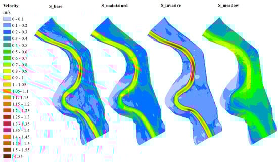 Changes in flow velocities in the study area at the peak of the flood (22 April 2006) in the case of the different model scenarios. S_base: the actual state of the floodplain vegetation; S_maintained: invasive plant control is performed on the dense and very dense understory patches; S_invasive: very dense invasive stands replace the patches with sparse to dense vegetation; S_meadow: meadows with low grass cover the floodplain.