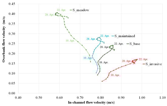 The temporal connection between the mean overbank and in-channel flow velocities could be described by a loop-like curve (Figure 6). During the first part of the loop (5–10 April; H: 747–848 cm), the in-channel flow velocities moderately vary, while an intense increase in overbank flow velocity could be observed. It can be explained by the gradual spread of the flood wave over the floodplain. After the flood wave covers the entire floodplain and slowly reaches its peak (11–22 April; H: 873–1062 cm), the in-channel flow velocity increases more and more intensively as a function of vegetation roughness. The greater the vegetation roughness of the floodplain, the more intensive the velocity increase rate in the channel, causing the loop curves to rotate counter-clockwise. For example, in the S_meadow scenario, the flow velocity in the channel decreases as the flood progresses. After reaching the peak in the third period (23–28 April; H: 1060–1036 cm), the falling limb slowly starts. At this time, both the in-channel and overbank flow velocities are reduced, and the curve inverts. In the last part of the flood wave (after 29th April; H: <1028 cm), the flood conveyance in the channel becomes more intensive as the impoundment by the Danube ceases. Thus, in-channel flow velocities start to increase, while overbank flow velocities slowly decrease.