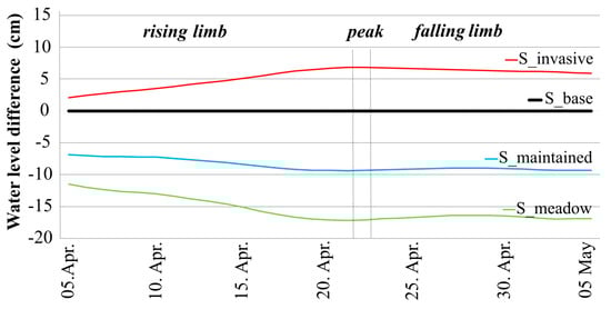 Due to the extremely dense vegetation (S_invasive), the water levels only exceed the S_base stages by 2 cm at the beginning of the rising limb. However, during the peak, their difference increases to 7 cm, however, and it remains at 6 cm during the falling limb.