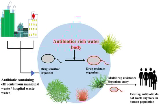 As mentioned earlier, antibiotic-based pollution is being found in soil/water resources/sewage [26,27]. Since it is harmful to human health and ecosystems, addressing its presence has to be considered a top priority, as it causes bacterial resistance and makes treatment against any infection ineffective. These drug-resistant bacteria could enter humans/higher animals through contaminated water or through food made using that water, and impact the gut microflora within the hosts [28] leading to several health ailments. Finding the source of contamination would help us to prevent the entry of antibiotics into humans or any living system. The sources of antibiotics are discussed below.