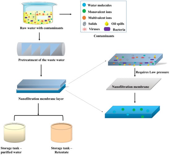 One of the main techniques involves using nanoparticles [142,143,144]. Nanofiltration is an effective method for the removal of large organic materials and average-sized minerals, but is not applicable to low-molecular weight organic substances such as methanol, because these membranes operate at very low pressures (Figure 6) [119]. Membranes used for nanofiltration are made of cellulose acetate blends or polyamide composites. The modified versions of UF membranes include sulfonated polysulfone. In the nanofiltration process, the wastewater is fed into the inlet and the incoming stream is separated into two parts: the permeate, which is the filtered component, and retentate, or concentrate, which is the non-filtered fraction that is rejected. NF is capable of successfully removing organic matter, and works on the principle of the application of hydrostatic pressure, which is used to convey a molecular mixture to the membrane’s surface. When pressure is applied, solvents and low-molecular weight solutes pass through the membrane, while other components are trapped. This is sufficient to eliminate ions that contribute significantly to osmotic pressure, resulting in reduced operating pressures. As soluble fractions cannot be eliminated by nanofilter membranes, highly contaminated fluids require a pretreatment process [140]. Nanofiltration membrane’s removal rates depend on the target antibiotic molecule; where macrolides have been removed with an efficiency rate of 80 to 95%. In a study using self-made polyethersulfone membrane nanofilters, the removal efficiency of the antibiotic amoxicillin was found to be 99.09% at a temperature of 298 K and pressure of 2 MPa [145,146].