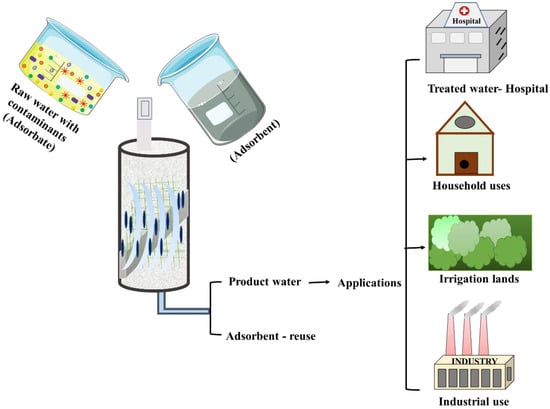 Understanding antibiotic absorption on adsorbents requires knowledge of their physical and chemical characteristics. Adsorption is the deposition of elements from a gas or liquid phase onto the surface of an adsorbent, which can be physical or chemical [156]. Because of its great efficiency, low cost, ease of operation, and design simplicity, adsorption technology has seen widespread use (Figure 7) [65]. Adsorption is a typical method used for removing metal ions from a variety of industrial effluents [157]. Magnetic nanoparticles, silver nanoparticles, activated carbon, nanotubes, and polymer nanocomposites have all been utilized as adsorbents to remove various pollutants, including heavy metals, which are extremely toxic even at low concentrations [121,158,159]. Adsorbents such as activated carbon can be used in an adsorption filtering process to remove high levels of antibiotic compounds, but the effectiveness of antibiotic absorption is influenced by several factors such as (i) activated carbon, (ii) target compound concentration, (iii) dissolved oxygen concentration, and (iv) pH and temperature [119]. Natural zeolite, bentonite, activated carbon, carbon nanotubes, and biochar are used to remove antibiotics from aquatic environments by adsorption [160]. The phenomenon of adsorption involves (i) the movement of the adsorbate via the stationary liquid film around the adsorbent—solute transfer in the bulk, (ii) the diffusion of film and transport of adsorbate along the film, (iii) the diffusion of pores and adsorbate through the porous structure into the active sites, and (iv) adsorption between the adsorbate and porous structure. The antibiotic adsorption capacity is further influenced by electrostatic and hydrophobic interactions between antibiotics and sludge. The mechanisms of adsorption can be further identified using an isotherm model such as Langmuir, Freundlich, Tempkin, etc. [161]. Antibiotics are classified as positive, neutral, or negative, depending on the pH of the solution, and the removal efficiency depends upon the electrostatic interaction between antibiotics and charged sorbents [132]. The effectiveness of MBR in treating water contaminated with antibiotics is increasingly being investigated. Membranous Biological Reactors (MBRs) have several advantages, including a higher solids retention time (SRT), reduced sludge generation, and a higher concentration of mixed liquid-suspended solids when compared to Conventional Activated Sludge Systems (CAS) [162]. The efficient removal of antibiotics such as Sulfamonomethoxine (SMM) (11%), Sulfamethoxazole (SMX) (6.5%), and Sulfadimethoxine (SDM) (19%) from wastewater using sorbents has been reported by researchers [162].