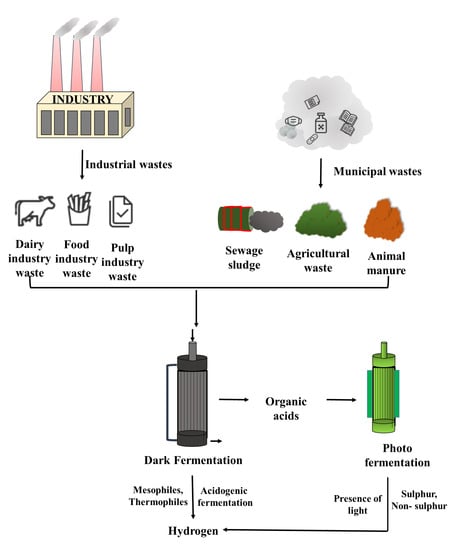 The growth of the world relies mostly on industrialization. Pollution is caused by these industries by utilizing more water and the excessive production of effluents []. Industrial wastes are substances that cause severe environmental pollution as they are non-biodegradable. The application of these industrial wastes in road construction has attracted many researchers in recent days []. The waste materials generated from these industries are renewable biomass and can be used for the production of biohydrogen. Industrial wastewater and biodiesel industry wastes are some examples of industrial wastes that can be used for biohydrogen production. Many reports on biohydrogen production from electrolysis and other chemical processes have been reported, but the biological conversion of wastes into hydrogen can be the best alternative method and also the most cost-efficient method []. Many starch- and cellulose-based materials are present in the waste products from the food and agricultural industries. These waste products are rich in carbohydrate content. It is easier to process the starch waste content by hydrolyzing it into maltose or glucose via enzymatic or acid hydrolysis followed by conversion into carbohydrates and then into hydrogen gas, but cellulose-containing wastes are difficult to process as they require the pre-treatment of wastes, and hydrolyses, followed by conversion into carbohydrates and then into biohydrogen production [,,].