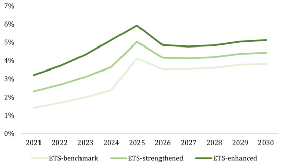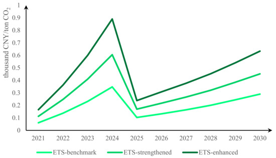 - The ETS-enhanced scenario, which is also similar to the ETS-benchmark scenario. The only difference is that carbon emissions in this scenario will reach the peak immediately, and the peak will be lower than the previous two scenarios.