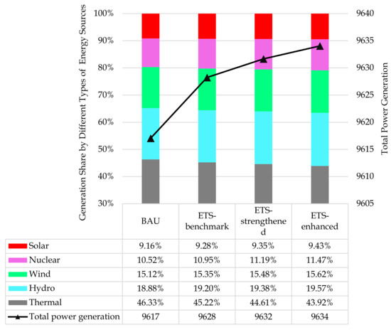 The main objective of this study is to examine how carbon trading affects renewable energy. Therefore, we first observe the impact of three simulated carbon trading scenarios on renewable energy from the perspective of electricity production and generation structure. From Figure 2, it can be seen that the ETS significantly increases electricity consumption, most likely due to energy substitution. With the existence of carbon trading, the price difference between renewable energy and fossil fuels has further reduced, leading energy consumers to prefer renewable energy over fossil fuels. Since almost all renewable energy comes from the power generation industry, electricity generation has seen a significant increase. Compared to the Business as Usual (BaU) scenario, the total electricity generation in the ETS-benchmark, ETS-strengthened, and ETS-enhanced scenarios has increased by 11, 15, and 17 billion kWh, respectively, by 2030.