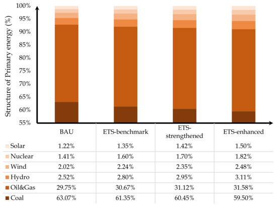 Primary energy mix in 2030. Notes: The bar and the left y-axis represent the share of primary energy from different sources.
