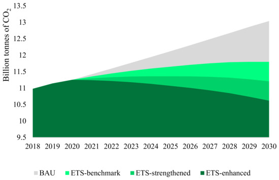 CO2 emissions during 2018–2030. Notes: The chart depicts the carbon emissions from 2018 to 2030 under different scenarios, where the area of each region represents its cumulative carbon emissions. The darkest portion represents the carbon emissions in the ETS-enhanced scenario, while the lighter portion represents the additional carbon emissions in the ETS-strengthened scenario compared to the ETS-enhanced scenario, and so forth.