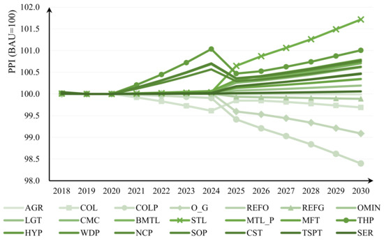 Producer price index (PPI) in ETS-benchmark scenario in 2030 relative to BAU scenario. Notes: The graph demonstrates the changes in producer price indices for various goods relative to the Business as Usual (BAU) scenario (BAU = 100) under the ETS-benchmark scenario. The complete industry names of the legend can be found in Table 1.