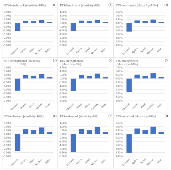 The sensitivity analysis of the ETS impact on the share of power generation. Notes: The figure shows the changes in core findings (changes in power generation share) when simulating a 10% increase or decrease in elasticity. The same row represents the same scenario, and the same column represents the same elasticity. The unit is the percentage change.