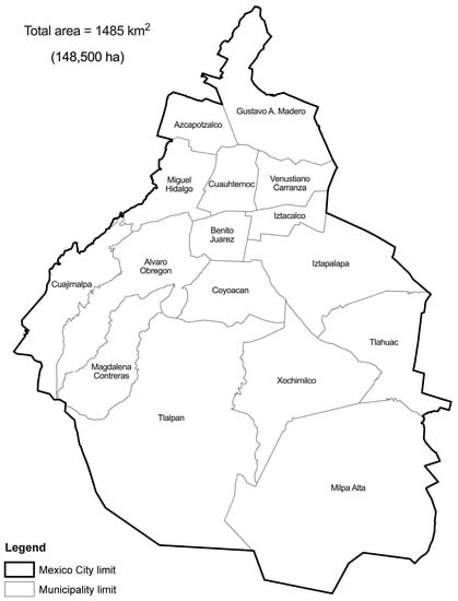 Total area and spatial distribution of the 16 municipalities of Mexico City.