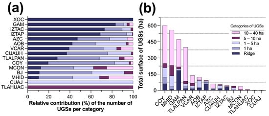 As depicted in Figure 2b, four municipalities showed a total surface >375 hectares of their UGSs. In these four municipalities, UGSs of 10–40 ha contributed the highest amount of surface: Gustavo A. Madero, 253 hectares (53.6%); Tlalpan, 313 hectares (78.4%); M. Hidalgo, 328 hectares (58.6%); and Coyocan, 352 hectares (58.5%). In contrast, ridges contributed the greatest amount of UGS surfaces in places such as Iztapalapa (59 hectares, 64.1%), Iztacalco (27 hectares, 60%), and Xochimilco (3 hectares, 100%).