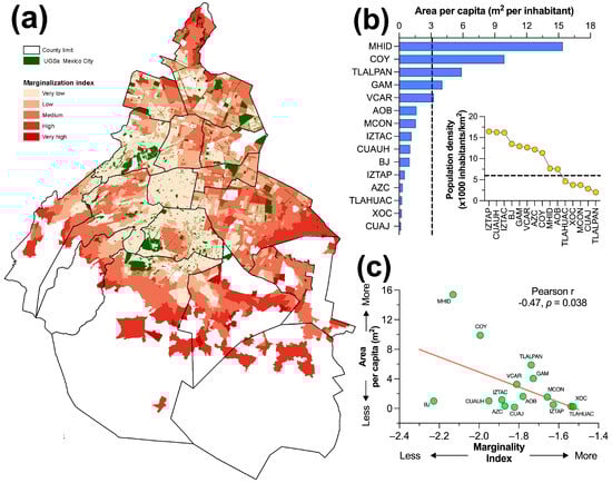 (a) Merge of the spatial distribution of UGSs in Mexico City and the marginality index for the localities of each municipality, (b) comparison of the area per capita of UGSs, and (c) association between the socioeconomic indices and the area per capita of UGSs for the municipalities of Mexico City. In b, the dotted lines refer to average values for Mexico City. In c, the red line represents the linear trend which was added to assist interpretation of the linear association.