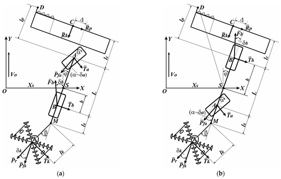 In the equations for the coefficients A13 and f21, the “+” sign corresponds to the forward movement of the tractor and “−” to the reverse one. The equations system (1) includes the following parameters: Ma is the mass of the tractor with a mounted header, kg; Ja is the tractor and header inertia moment relative to the vertical axis passing through point S (see Figure 1), kg·m2; Jm is the disk harrow inertia moment about the axis passing through point M, kg·m2; ka, kb, kk are coefficients of resistance to tire yaw of the tractor front and rear wheels, as well as the wheels of the disc harrow, respectively, kN·rad−1; L, b, ∆, lc, lz, lk are linear design parameters of the unit (see Figure 1).