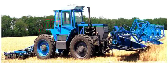 For mounted implements, such results were obtained in ploughing [30] and row crops [31]. At the same time, the machine-tractor units movement velocity mode was considered from 1 to 5 m·s−1 [32].