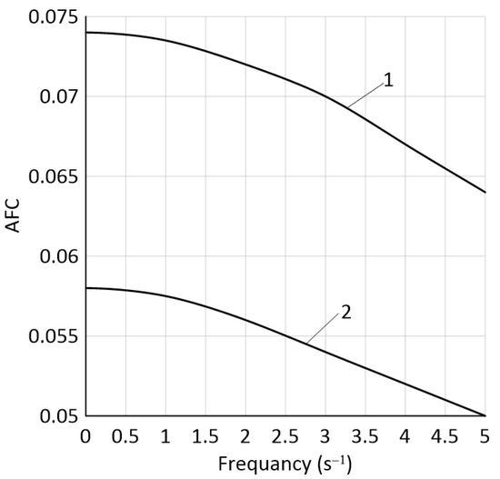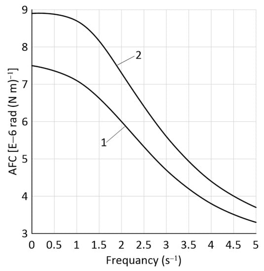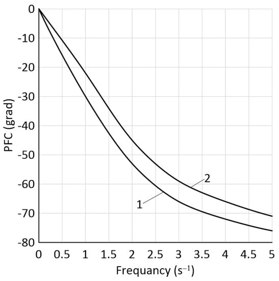 As follows from the analysis of the equations system (1), the external disturbance acting on the harvesting unit in the horizontal plane is the momentum described by Equations (2) or (3). As the frequency of its oscillations increases from 0 to 5 s−1, the calculated AFCs (Figure 4) decrease, and the PFCs (Figure 5) increase. Note that both results are desirable. They are due to a stronger manifestation of the unit inertial properties in the role of a damper at higher frequencies of the momentum Mr oscillations.