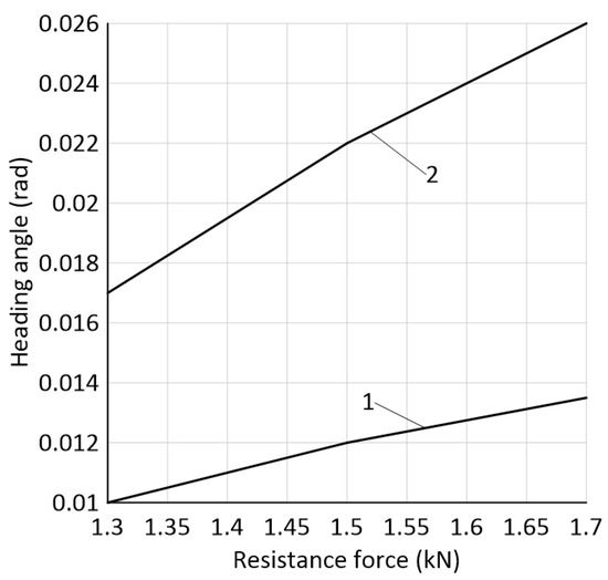 It is quite natural that the specified momentum increases with an increase in the force Pr transverse component value. This occurs either with an increase in the tillage machine deviation angle (β, Figure 1b) or with an increase in its traction resistance. In particular, this may be the case with an increase in the velocity of the operating movement V0. Calculations show that a change in the V0 parameter from 2 to 4 m·s−1 causes a corresponding increase in the tractor heading angle. At the same time, the value and the parameter’s φ growth intensity are higher at a higher harvesting unit velocity (Figure 7).