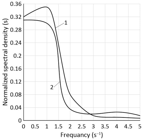 Normalised spectral oscillation densities of the tractor heading angle at its forward (1) and reversing (2) movement.