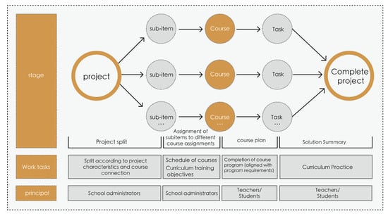 - Between universities and teachers: As project managers, universities uniformly manage projects and allocate them to different teachers based on disciplines, majors, grades, and other factors. As actual project leaders, teachers are responsible for universities and integrate project requirements with actual teaching curricula. Therefore, university management can split large projects on the service platform, and teachers can plan actual courses according to the project requirements on the platform, thus achieving the digital management of projects and courses;