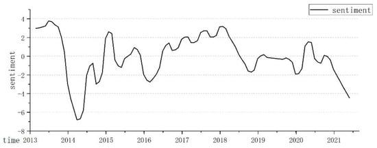 The real estate entrepreneur confidence index (expectation index) was also chosen as the fourth emotion proxy. The real estate entrepreneur confidence index takes 100 as the critical value, with values changing in a range between 0 and 200. When the confidence index is higher than 100, it indicates that entrepreneurs’ development is expected to be bullish in the real estate industry. Conversely, when the confidence index declines to be lower than 100, it was indicated that entrepreneurs’ development is evaluated to be bearish in the real estate industry. The sentiments of staff in real estate companies play an important role in real estate sentiment, but the sentiments of builders have a higher impact on market prices than buyers [33]. Entrepreneurs are also important participants in the real estate market. When analyzing real estate sentiment, it is meaningful to include assessments on the sentiments of real estate entrepreneurs in sentiment analysis. The sentiment of real estate entrepreneurs is an important indicator reflecting entrepreneurs’ feelings and confidence towards perceptions of the macroeconomic environment. Relevant results can be used to predict the changing trend of economic development.