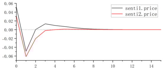 In order to verify the rationality of the sentiment indexes, they were generated by the state-space model with dependent input of values from principal component analysis. The VAR model was used to verify the relationship between sentiment and price, according to Hui et al. [47]. Both indices were found to be useful for predicting housing prices. The comparison results of impulse responses are shown in Figure 3. The coefficient Senti.price is the impulse response of the state-space model sentiment index to price. Both coefficients of senti1.price and senti2.price present the promotion of positive sentiment on the increase in the first period and subsequent decrease, respectively. This is consistent with the findings of Hui et al. [47]. The AIC (Akaike information criterion) and BIC (Bayesian Information Criterion) of the state space model sentiment index are −1435.213 and −1326.218, respectively. The eigenvalues of AIC and BIC in the principal component analysis are −1434.235 and −1325.24, respectively. Values of AIC and BIC for sentiment indices of the state-space model are significantly lower than those indicated by principal component analysis. This indicates that the sentiment index generated by the state-space model has a higher accuracy than the sentiment index generated by the principal component analysis for predicting prices.
