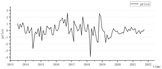 In this paper, the average prices of new residential properties are selected as a variable, which is obtained by extracting and processing the average price of real estate in 30 large and medium-sized cities. China has been in a state of rapid development for decades, during which real estate prices showed a long-term upward trend. When measuring the impact of short-term regulatory policies on prices, full consideration must be given to eliminating the impact of long-term trends. The Hamilton-HP filter was used to remove the influence of long-term trends and obtain periodic housing prices. Hamilton [48] modified the HP filter method and ensured that the identified residual components were stationary. It provided consistent estimates for various unknown and possibly non-stationary processes. As suggested by Hamilton [48], two years are used as the standard base period. Dynamic changes in real estate cyclical prices are shown in Figure 4.