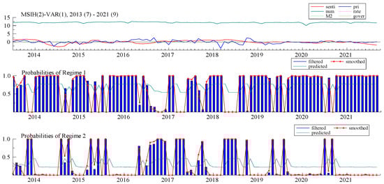 From the criteria of AIC, HQ, and SC, it can be seen that MSIH (2)-VAR (1), the model in the mean model is better than other models in log-likelihood, AIC, HQ, and SC. Hence, the equation of MSIH (2)-VAR (1) was used. The estimated results of the model are the basis for the analysis.